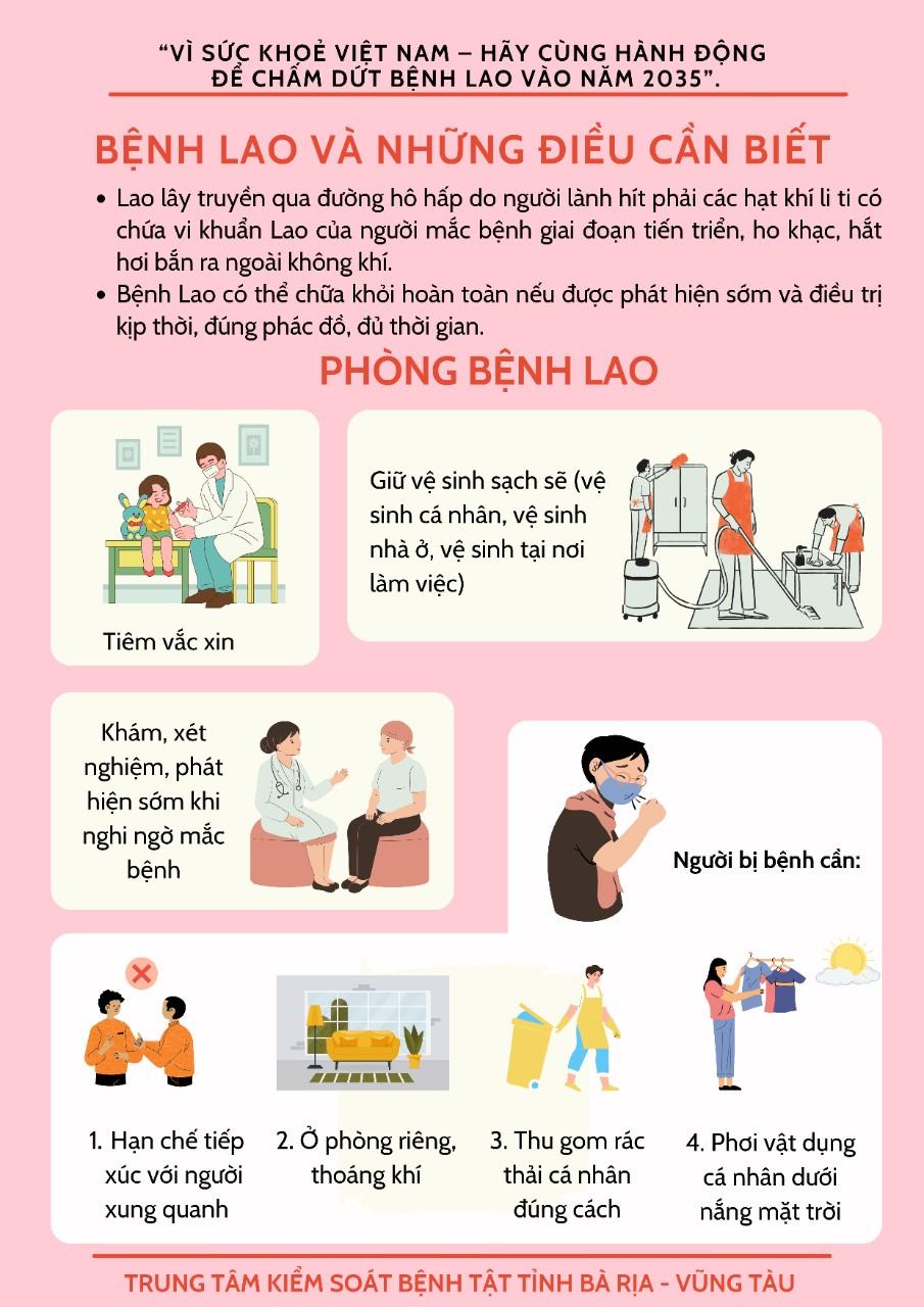 3. Người bị bệnh Lao phải điều trị càng sớm càng tốt, tránh lây lan cho những người trong gia đình và người xung quanh. Bên cạnh đó, bệnh nhân Lao không được khạc nhổ bừa bãi; tốt nhất là đeo khẩu trang liên tục trong 02 tháng đầu điều trị. Cần phơi chăn, chiếu, vật dụng của bệnh nhân Lao ra nắng mỗi ngày.